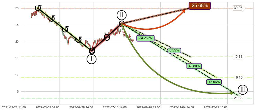➣ 调整浪已超过预测的c点位置,后续大趋势循环浪继续下跌概率74.32%,谨慎做多