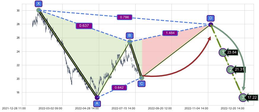 ➣ D点拟合预测价格27.94,距离最后交易收盘价格20.43相差 +36.76%