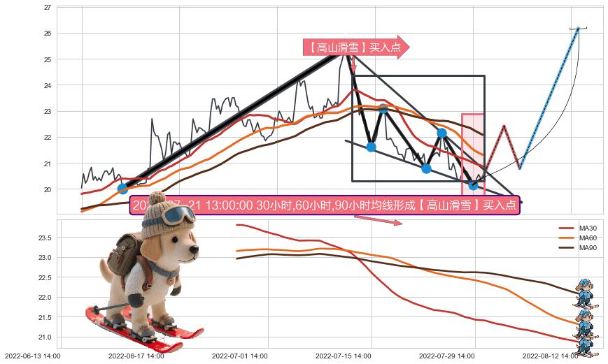 从2022-04-27 09:00至2022-07-19 14:00,共包含214个小时,阶段股价上涨24.46%,阶段股价变动位移路程比: 1 : 9,上涨趋势角度: 44.1