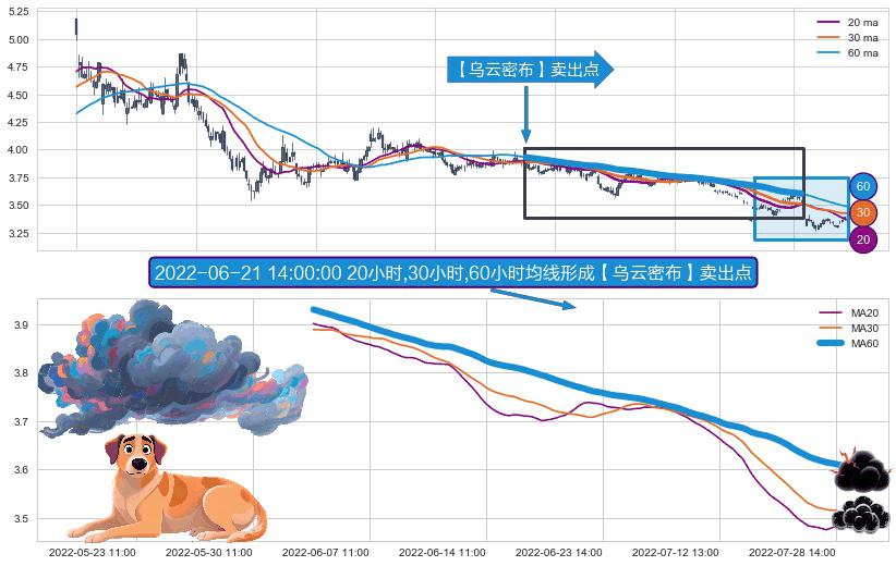 形态多维评估: ⚀ 2022-06-02 09:00:00小时-2022-08-01 13:00:00小时显现 20小时-30小时-60小时均线 【乌云密布】卖出点 看空信号,后市看跌,卖出