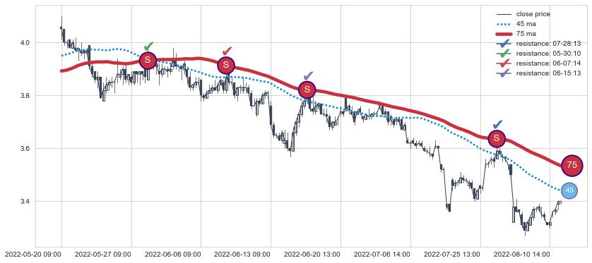 下跌趋势05-20 09:00-08-12 14:00,均线75确认关键阻力4处