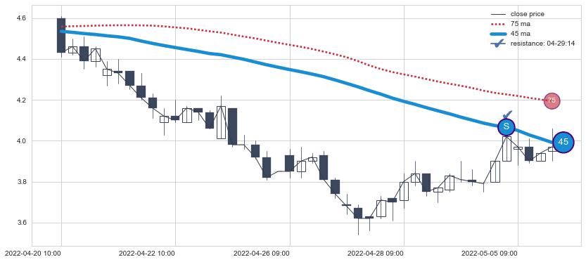 下跌趋势04-20 10:00-05-05 13:00,均线45确认关键阻力1处