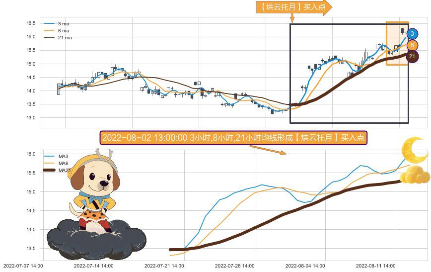 ⚀ 2022-07-20 14:00:00小时-2022-08-12 14:00:00小时显现 3小时-8小时-21小时均线 【烘云托月】买入点 看多信号,后市看涨,买入