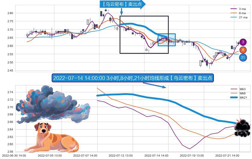 形态多维评估: ⚀ 2022-07-07 14:00:00小时-2022-07-21 14:00:00小时显现 3小时-8小时-21小时均线 【乌云密布】卖出点 看空信号,后市看跌,卖出