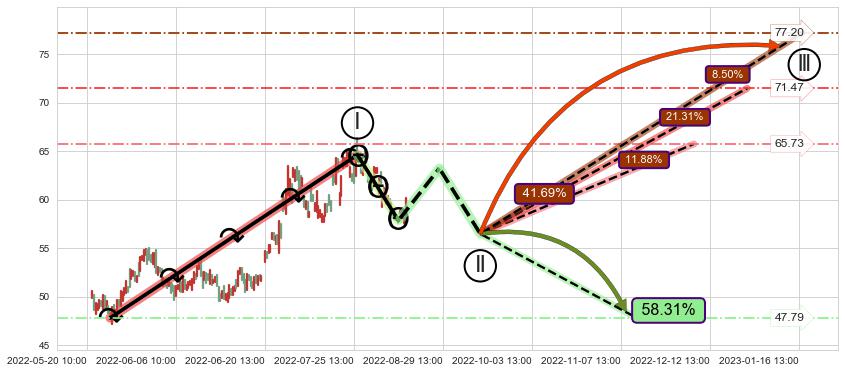 ➣ 高概率大级别循环上涨浪被破坏,反转向下(突破5浪起点)概率58.31%