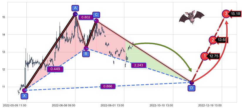 ➢ 距离预测D点位置尚有下跌空间,短线依然【看跌】, 耐心等待看涨【蝙蝠】形态反转启动