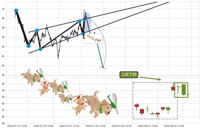 | 4 🅚:下跌孤独十字星 ➕ 📐:升楔型猜想突破点临近,临近关键支撑位,预期下沉突破下跌 ☞ 看空信号 ⇥ 【🅚线】交织【图形】⇥ 综合量化分数: 46 | > |