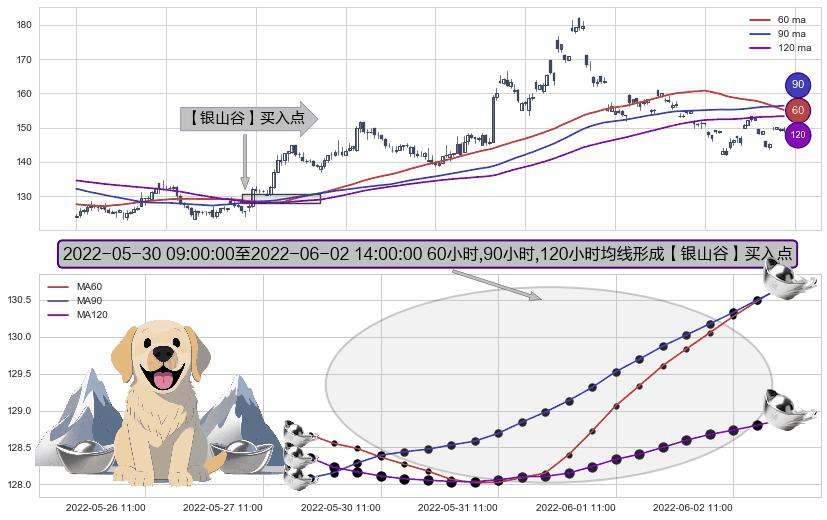 形态多维评估: ⚀ 2022-05-30 10:00:00-小时至2022-06-02 14:00:00-小时显现 60小时-90小时-120小时均线 【银山谷】买入点 看多信号,后市看涨,买入