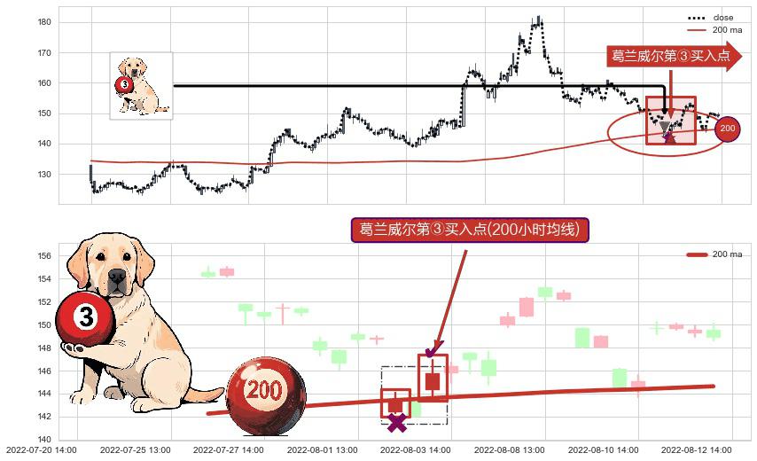 形态多维评估: ⚀ 2022-08-03 13:00:00-小时显现 葛兰威尔均线 200小时均线 第③买入点 上升趋势的中继信号,后市看涨,买进信号