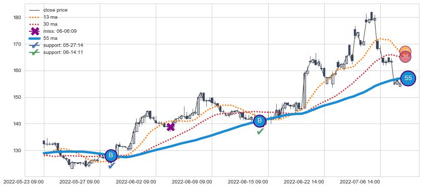 上涨趋势05-23 09:00-07-12 13:00,均线55确认关键支撑2处