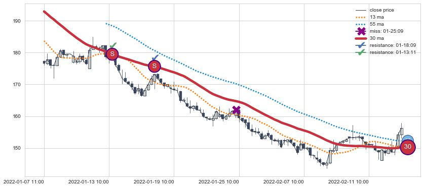 下跌趋势01-07 11:00-02-15 10:00,均线30确认关键阻力2处
