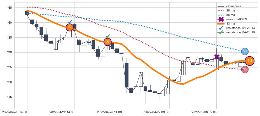 下跌趋势04-20 14:00-05-09 10:00,均线13确认关键阻力2处