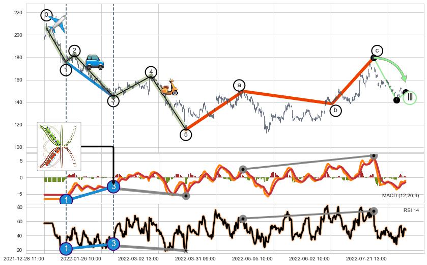 ➢ a,c调整浪MACD, RSI, KDJ走势都【未出现】背离,abc走势延续, 5浪反转概率增强