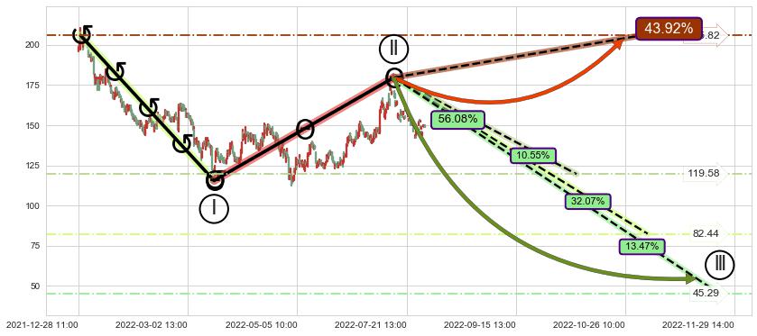 从2021-12-29 10:00至2022-02-08 11:00,共包含118个小时,阶段股价下跌-34.54%,阶段股价变动位移路程比: 1 : 2