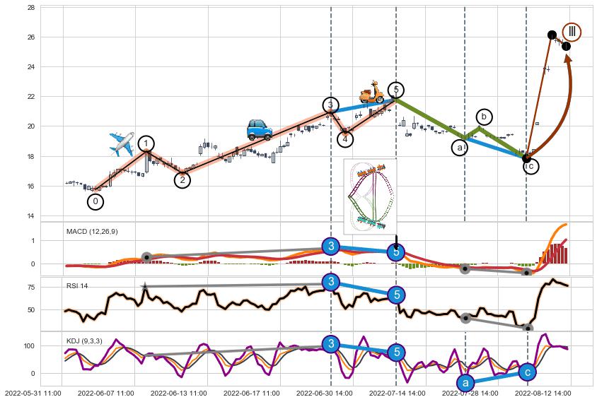 ➣ 1,3,5驱动浪MACD, RSI, KDJ走势都出现【常规背离】反转信号增强