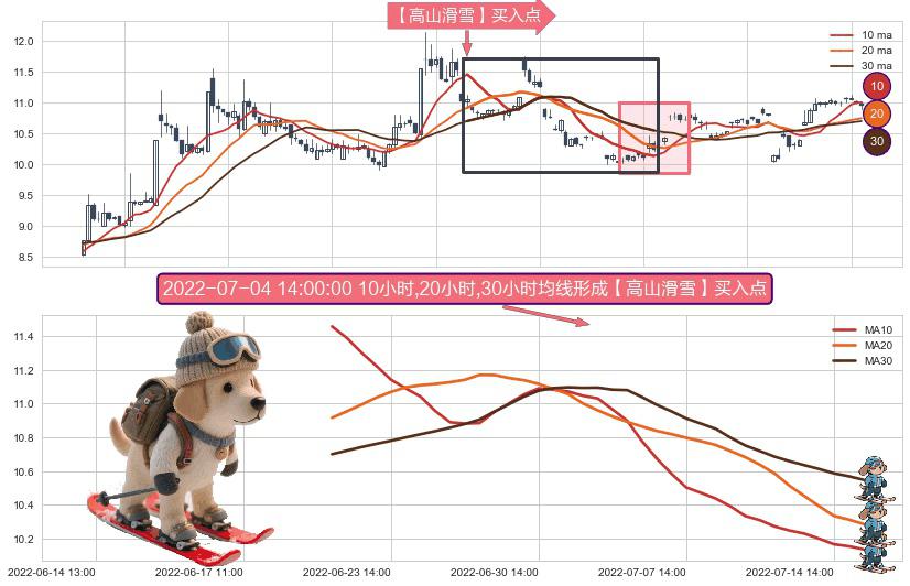 形态多维评估: ⚀ 2022-06-21 14:00:00小时-2022-07-15 14:00:00小时显现 10小时-20小时-30小时均线 【高山滑雪】买入点 看多信号,后市看涨,买入