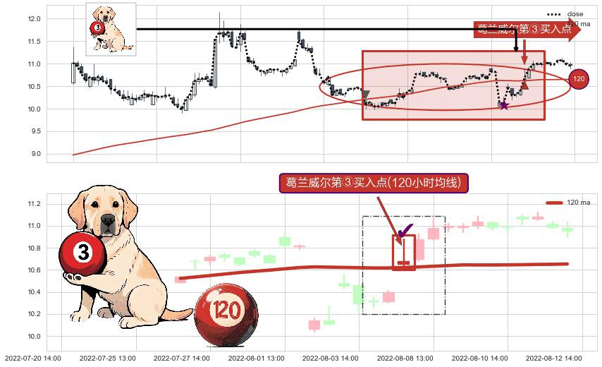 形态多维评估: ⚀ 2022-08-05 13:00:00-小时显现 葛兰威尔均线 120小时均线 第③买入点 上升趋势的中继信号,后市看涨,买进信号
