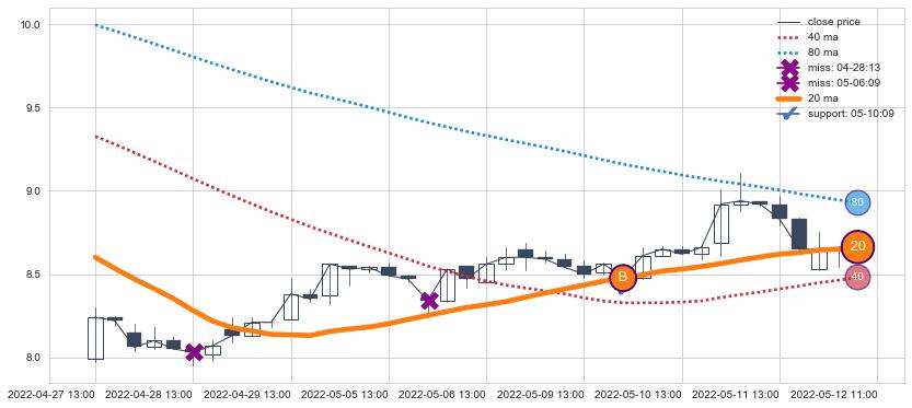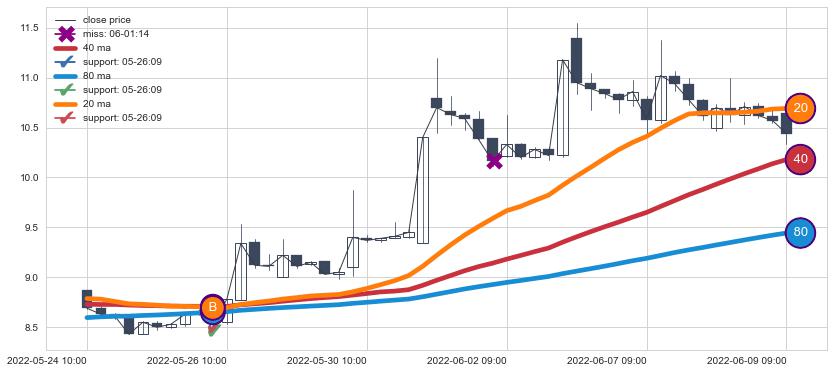 上涨趋势05-24 10:00-06-09 09:00,均线40, 80, 20确认关键支撑1处