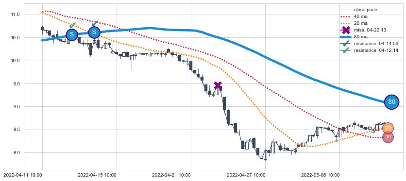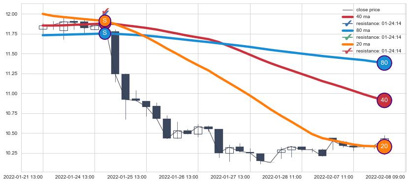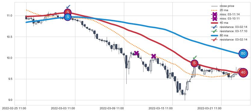 下跌趋势02-25 11:00-03-22 14:00,均线40, 80确认关键阻力2处