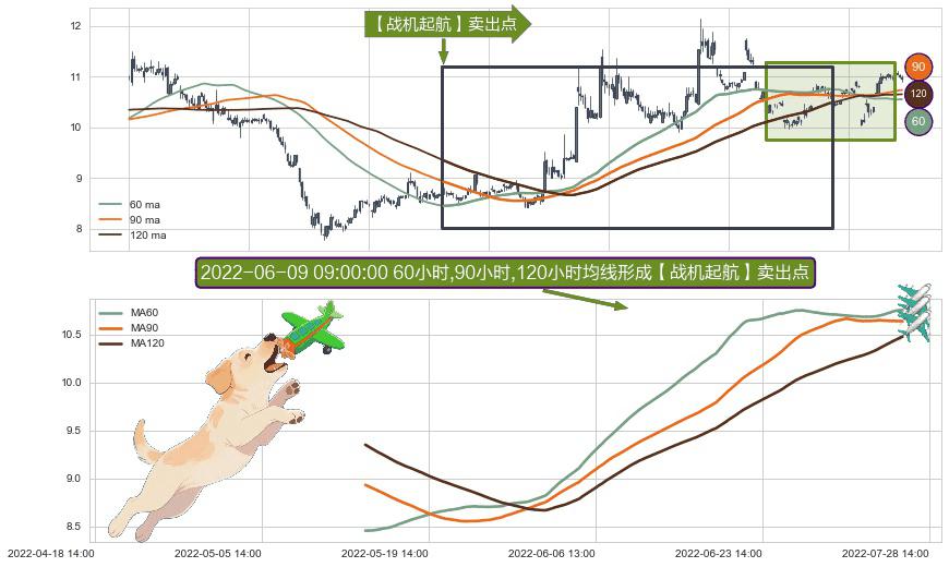 形态多维评估: ⚀ 2022-05-16 09:00:00小时-2022-07-22 14:00:00小时显现 60小时-90小时-120小时均线 【战机起航】卖出点 看空信号,后市看跌,卖出