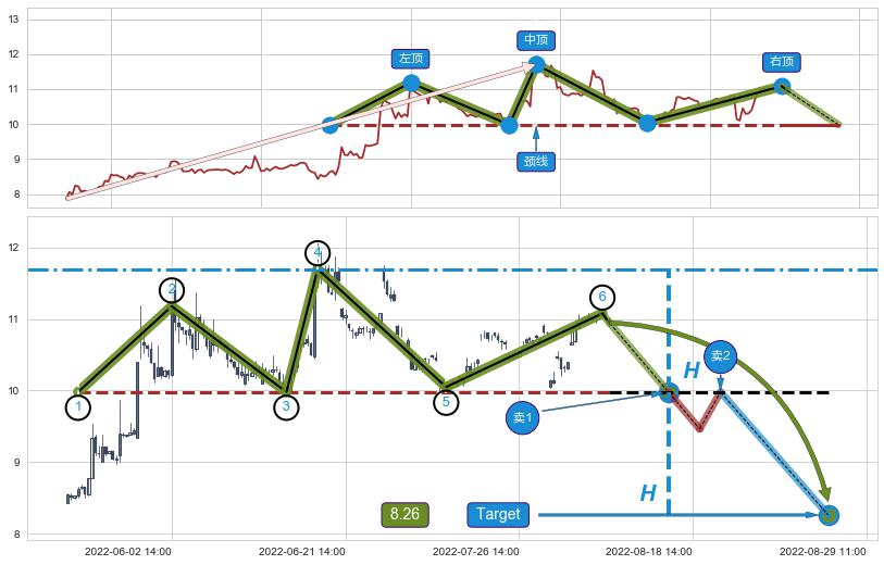 ➢ 最小反转跌幅→𝐇: 1.7200 (三重顶波峰高点到两个波谷连线的垂直距离)