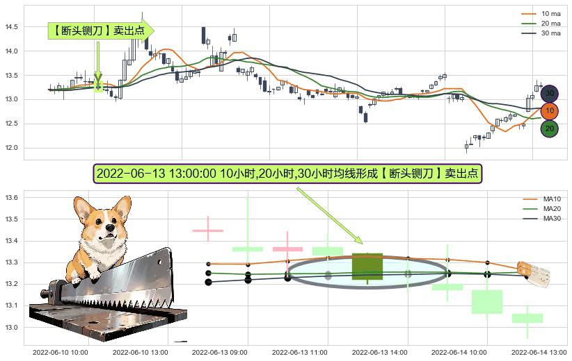 形态多维评估: ⚀ 2022-06-13 13:00:00小时显现 10小时-20小时-30小时均线 【断头铡刀】卖出点 看空信号,后市看跌,卖出