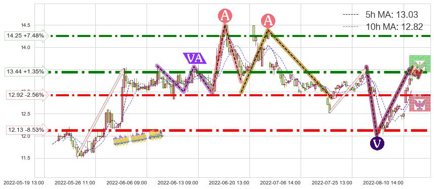 ♘ 阻力价格位13.44,可信任强度92.12%,距离最后交易2022-08-12 14:00形成的收盘价格13.26相差 +1.35%
