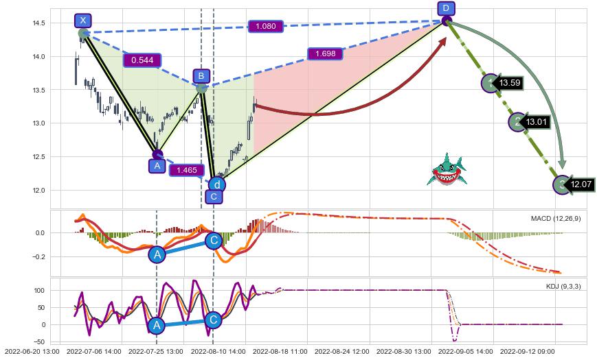 ➣ D点拟合预测价格14.53,距离最后交易收盘价格13.26相差 +9.59%