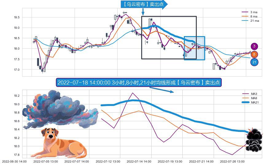 形态多维评估: ⚀ 2022-07-08 14:00:00小时-2022-07-26 14:00:00小时显现 3小时-8小时-21小时均线 【乌云密布】卖出点 看空信号,后市看跌,卖出