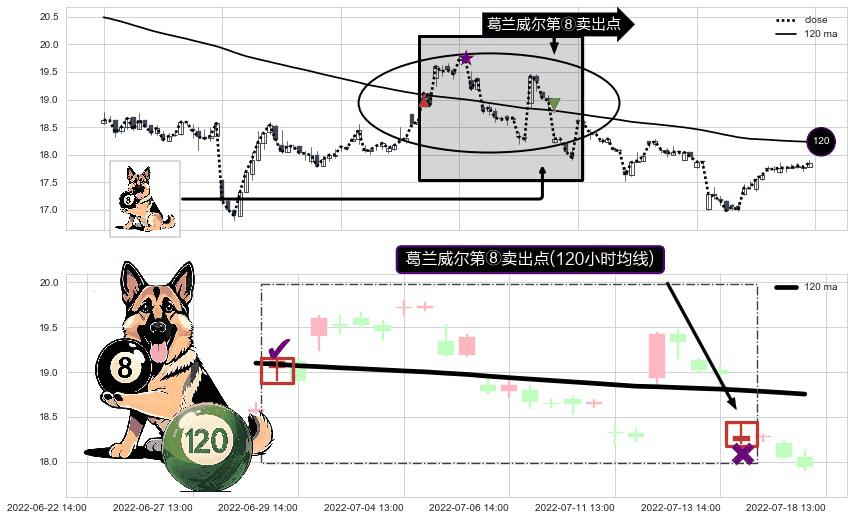 形态多维评估: ⚀ 2022-07-14 13:00:00-小时显现 葛兰威尔均线 120小时均线 第⑧卖出点 下降趋势的中继信号,后市看跌,卖出信号