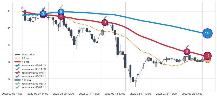 下跌趋势03-03 14:00-03-23 14:00,均线45, 110确认关键阻力4处