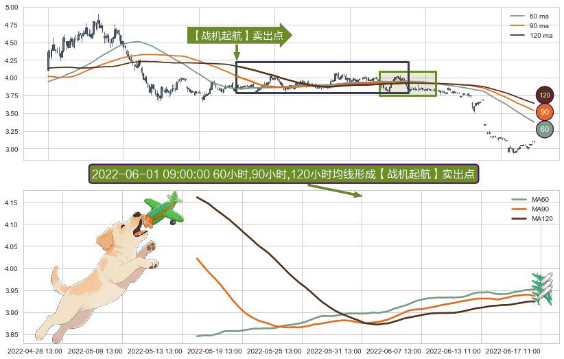 形态多维评估: ⚀ 2022-05-16 13:00:00小时-2022-06-17 09:00:00小时显现 60小时-90小时-120小时均线 【战机起航】卖出点 看空信号,后市看跌,卖出