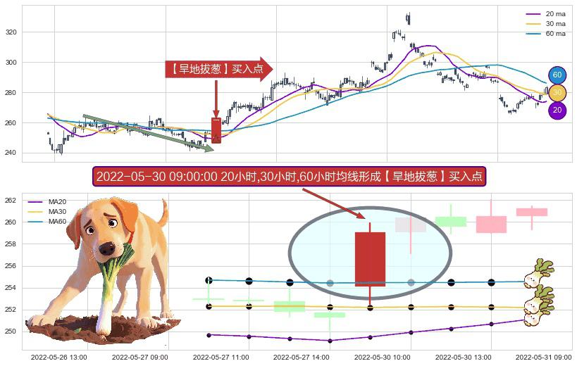 ⚀ 2022-05-30 09:00:00小时显现 20小时-30小时-60小时均线 【旱地拔葱】买入点 看多信号,后市看涨,买入