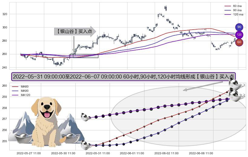 ⚀ 2022-05-31 10:00:00-小时至2022-06-07 09:00:00-小时显现 60小时-90小时-120小时均线 【银山谷】买入点 看多信号,后市看涨,买入