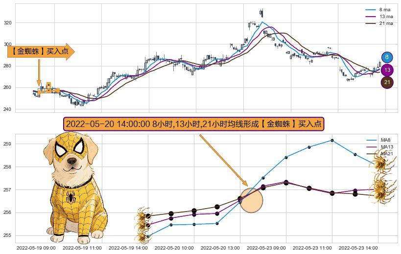 ⚀ 2022-05-20 14:00:00小时显现 8小时-13小时-21小时均线 【金蜘蛛】买入点 看多信号,后市看涨,买入