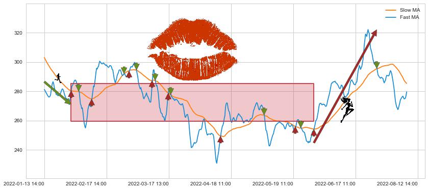 ⚅ 卖点向下突破均线后,价格走势有持续向下的迹象,但动能稍显不足,迟迟不能远离均线