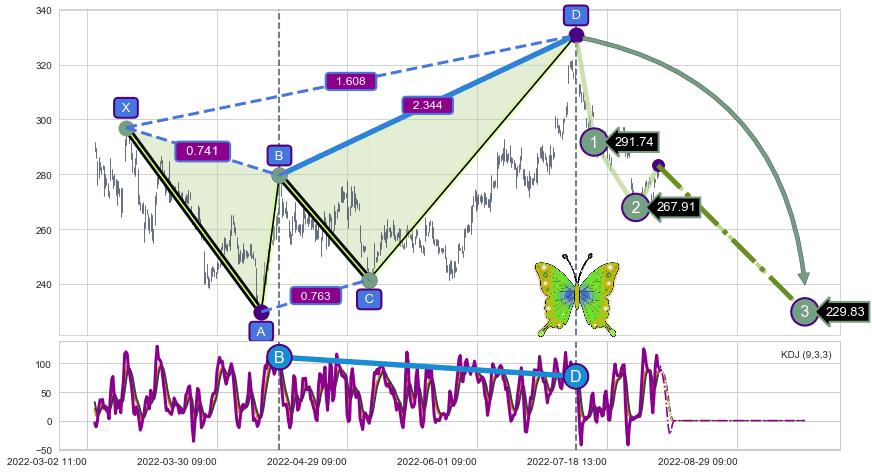➣ 已完成【蝴蝶】形态起点X: 02-09:09, 终点D: 04-11:14, 共212交易小时