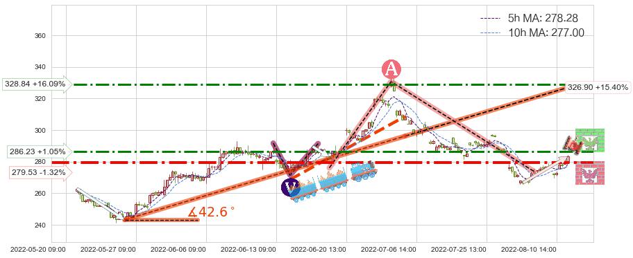 ♘ 阻力价格位286.23,可信任强度68.66%,距离最后交易2022-08-12 14:00形成的收盘价格283.27相差 +1.05%