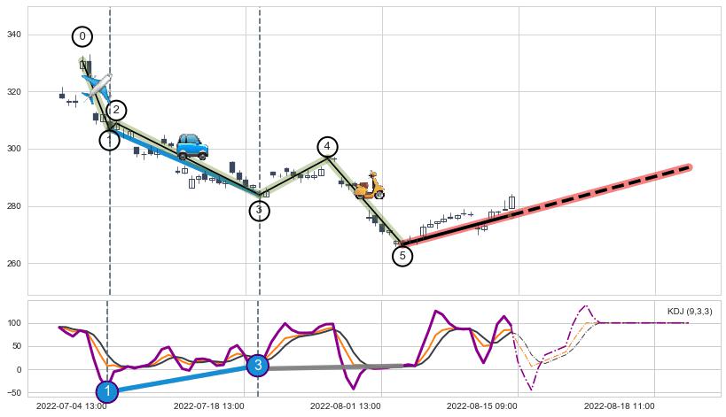 ➢ 第一, 三驱动浪端点:【KDJ】走势出现【常规背离 & 反转信号】背离程度75.49%,背离夹角角度95.9˚,背离程度较大