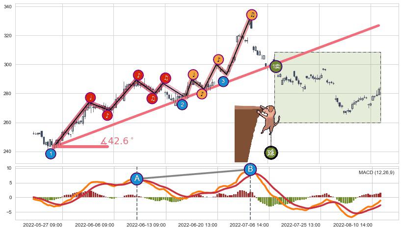 从2022-06-14 09:00至2022-07-04 14:00,共包含42个小时,阶段股价上涨12.21%,阶段股价变动位移路程比: 1 : 3,上涨趋势角度: 54.7