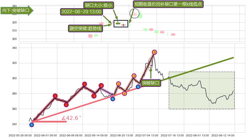 ✂️ 2022-05-26 10:00-2022-07-04 14:00上升趋势存在反转[风险],其原上升趋势的支撑位(326.90)已破位[强阻力信号],原上升趋势角度: 42.6˚