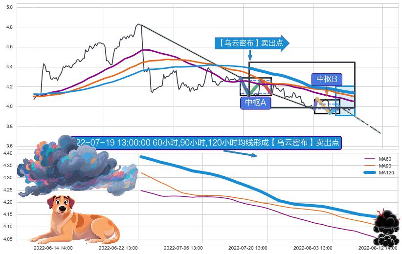 🦴 长线均值回复组合短线趋势跟踪[强阻力信号]2022-05-25 13:00-2022-08-05 14:00下跌趋势依然成立(下跌趋势跟踪依然存在),短线价格略微上行反弹(均值回复猜想),即将接近下跌趋势提供的未破位阻力价格:3.947。