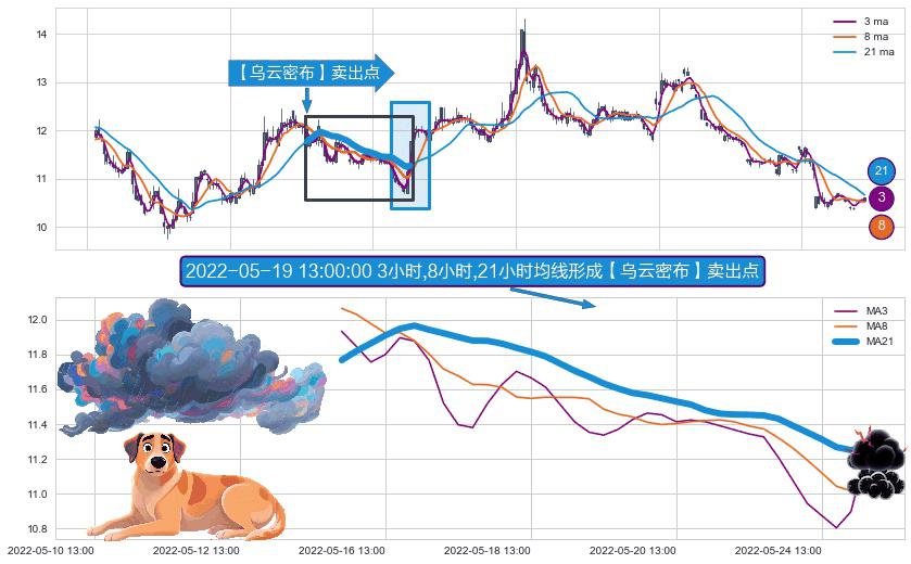 ⚀ 2022-05-16 09:00:00小时-2022-05-25 10:00:00小时显现 3小时-8小时-21小时均线 【乌云密布】卖出点 看空信号,后市看跌,卖出