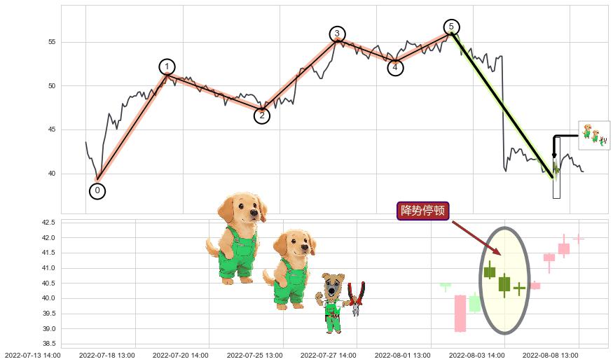 从2022-06-27 14:00至2022-08-08 13:00,共包含60个小时,阶段股价下跌-24.97%,阶段股价变动位移路程比: 1 : 3,下跌趋势角度: 22.6,2022-07-15 13:00向↘︎形成缺口,跳空下跌-23.73%˚