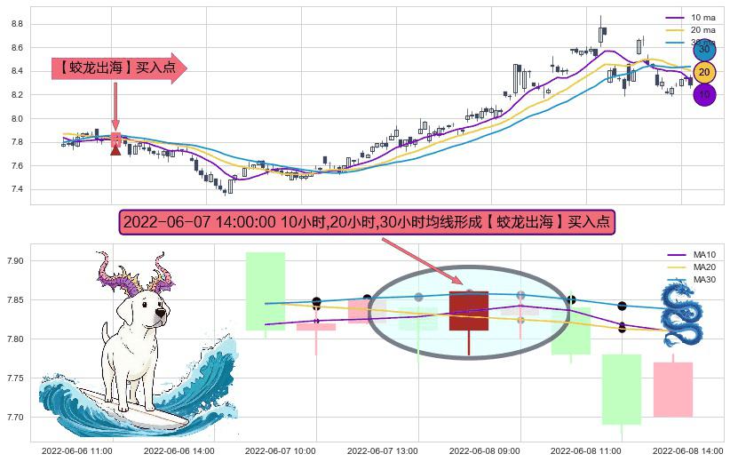 形态多维评估: ⚀ 2022-06-07 14:00:00小时显现 10小时-20小时-30小时均线 【蛟龙出海】买入点 看多信号,后市看涨,买入