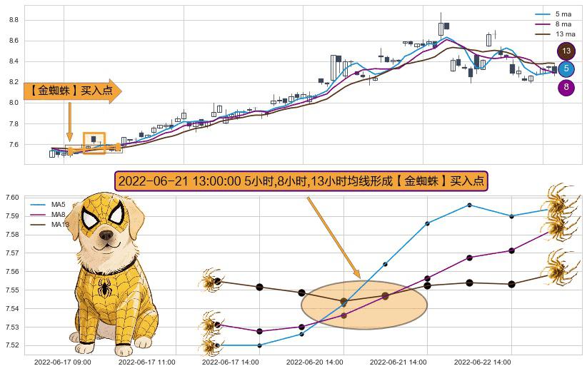 形态多维评估: ⚀ 2022-06-21 13:00:00小时显现 5小时-8小时-13小时均线 【金蜘蛛】买入点 看多信号,后市看涨,买入