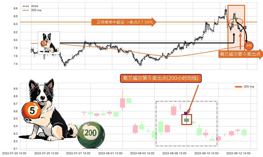 形态多维评估: ⚀ 2022-08-08 13:00:00-小时显现 葛兰威尔均线 200小时均线 第⑤卖出点 上升趋势均值回复的短线回落信号,后市看跌,卖出信号