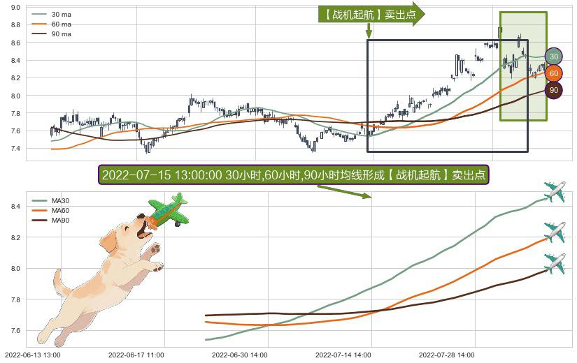 形态多维评估: ⚀ 2022-06-22 14:00:00小时-2022-08-08 14:00:00小时显现 30小时-60小时-90小时均线 【战机起航】卖出点 看空信号,后市看跌,卖出