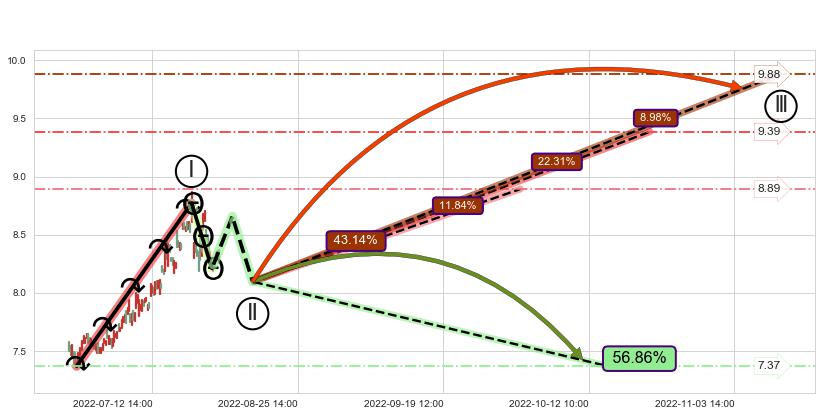 ♘ 支撑价格位7.44,可信任强度94.88%,距离最后交易2022-08-12 14:00形成的收盘价格8.28相差 -10.11%