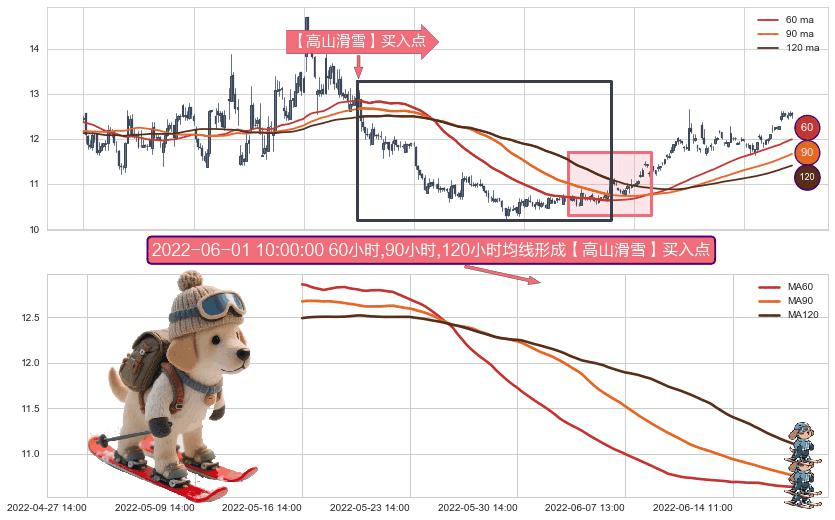 形态多维评估: ⚀ 2022-05-16 14:00:00小时-2022-06-17 10:00:00小时显现 60小时-90小时-120小时均线 【高山滑雪】买入点 看多信号,后市看涨,买入